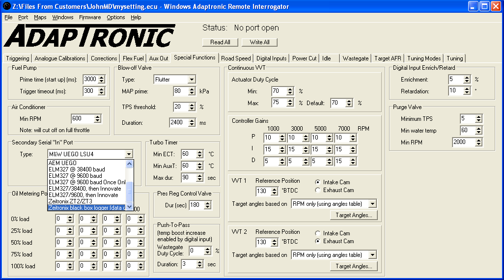 When it is connected to the ECU, the ECU will spread out the data after you have set te serial port settings to Zeitronix output. You can then run the Zeitronix software on your laptop and look at the output on your ECU.